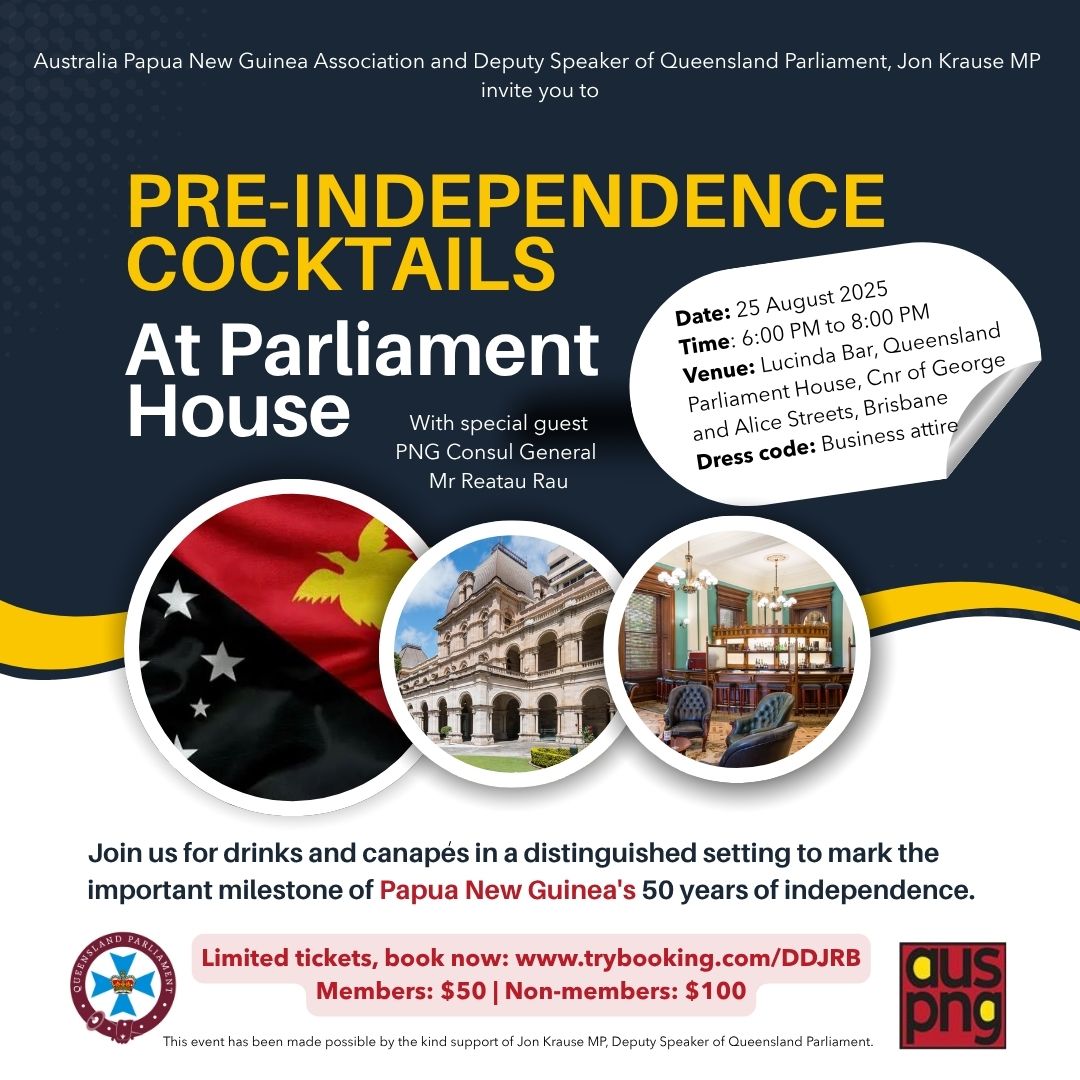 EVENTS AUSTRALIA PAPUA NEW GUINEA ASSOCIATION Events Pre-Independence Cocktails at Parliament House Learn More 2025 AGM Dinner Learn More 2024 AGM Dinner Learn More Conquering Digital Inequality in PNG and Asia Pacific Learn More Then, Now and... What's Next Learn More Meet. Greet. Connect. Learn More Business insights into operating in Papua New Guinea Learn More Building a Sustainable and Viable Manufacturing Industry in PNG Learn More Delivering Health Programs in PNG Learn More Auditing through the Pandemic Learn More Making Positive Changes to Lives in PNG Learn More